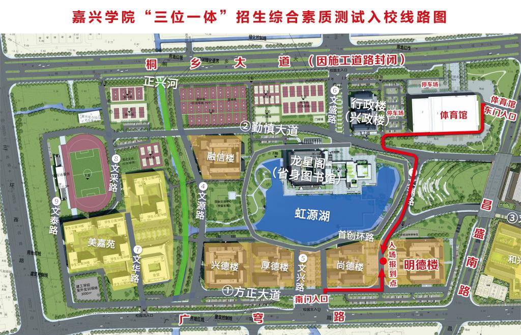 因道路施工,学校东门(嘉杭路118号)、北门(桐乡大道)封闭,考生应从南门(广穹路899号)或体育馆东门(昌盛南路与桐乡大道交叉口南约140米)入校。因测试当天人数相对较多,为避免拥堵,请考生务必提前入校,并按时前往明德楼西门处等候入场。上午场7:30后禁止考生入场,下午场12:00后禁止考生入场,迟到作自动弃考处理。