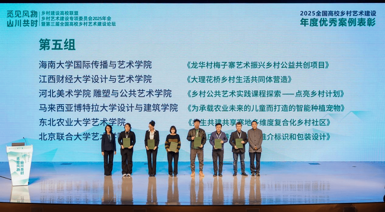 今年会“海岛艺术创新研究”团队作品《龙华村梅子寨艺术振兴乡村公益共创项目》从来自60余所高校的近300件参展作品中脱颖而出,荣获“2025全国高校乡村艺术建设年度优秀案例”。该团队由包格日乐吐教授领衔,张春梅、王莉、志勇、束博等师生共同参与组建。