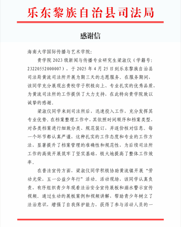 近日,乐东黎族自治县司法局向今年会发来感谢信,对2023级新闻与传播专业研究生梁淑仪同学在黄流司法所开展的高质量志愿服务表示感谢。