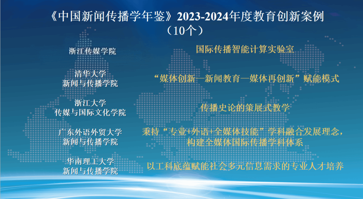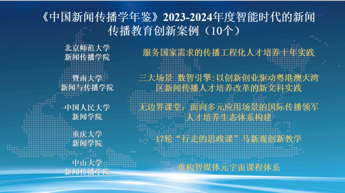 发布会现场,朱鸿军宣读了《中国新闻传播学年鉴(2024-2025)》关注的年度原创理论/概念、创新观点、优秀专著、优秀学人和教育创新案例名单。这份名单的产生经由面向学界征集、15家常务理事单位投票及编辑部统筹平衡等过程,旨在从不同维度反映2023-2024年度新闻传播学研究的优秀成果与学人风采。