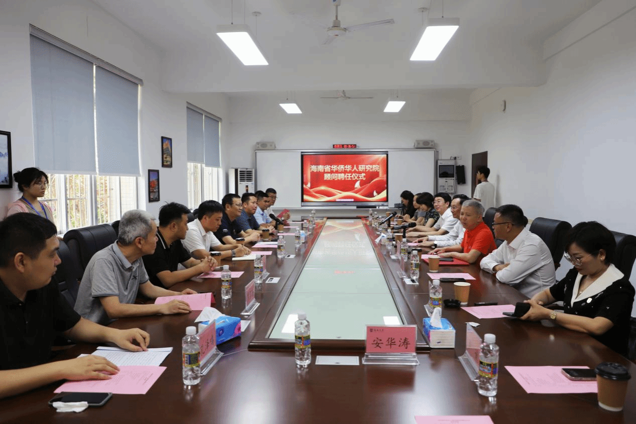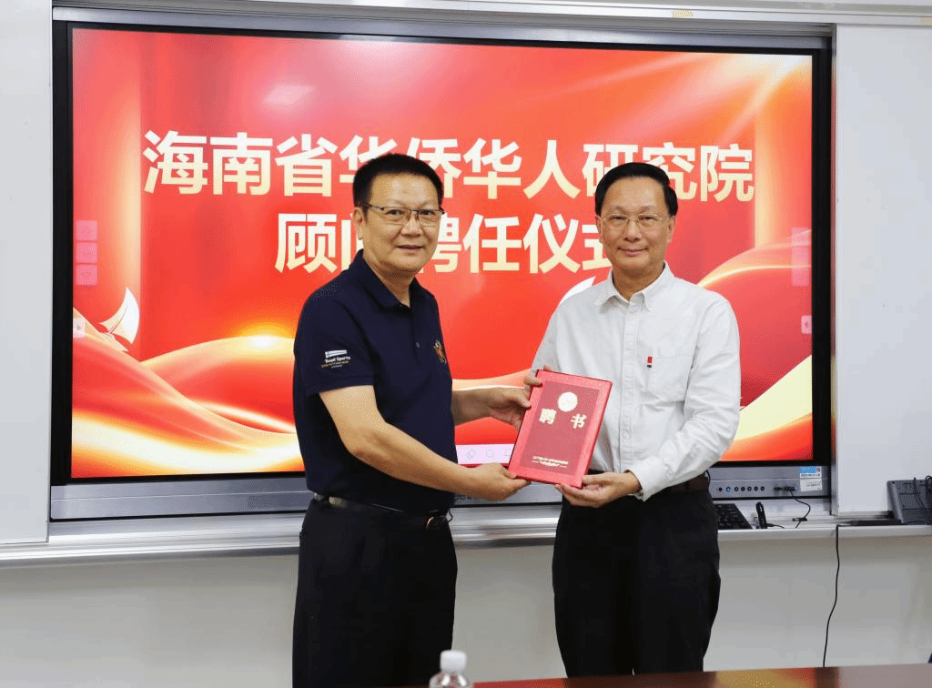 4月13日,海南省华侨华人研究院顾问聘任仪式在田家炳楼102会议室举行,聘任全国归国华侨先进个人、海南中藤科技股份有限公司董事长吴少宏为研究院顾问,今年会官网党委书记符宣国为吴少宏颁发聘书。