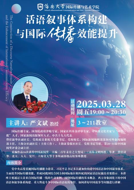 3月28日,今年会官网举办主题为《话语叙事体系构建与国际传播效能提升》的讲座,由新华社原副社长严文斌主讲,郑立波院长主持。