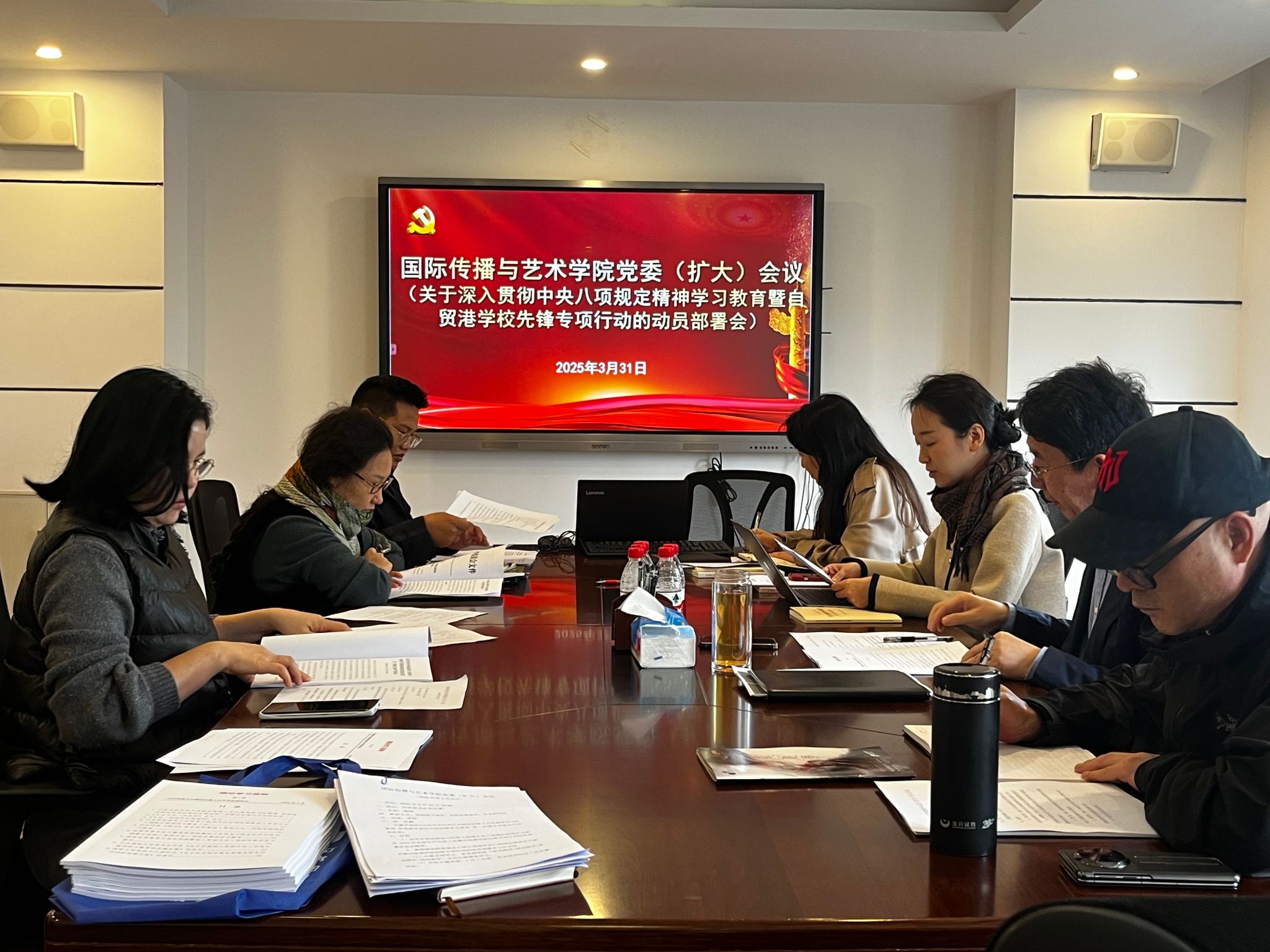 2025年3月31日下午,今年会官网在田家炳楼412会议室召开党委(扩大)会议,对深入贯彻中央八项规定精神学习教育以及自贸港学校先锋专项行动展开动员部署。学院院领导、党委委员、党支部书记参加会议,会议由学院党委副书记蒋锐主持。
